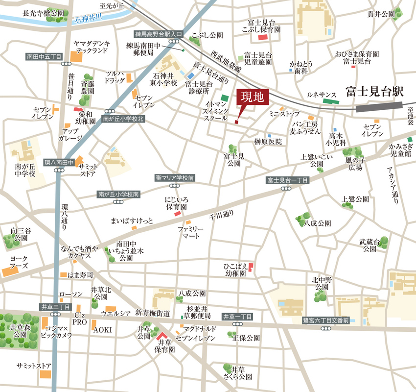 西武池袋線「富士見台」駅 徒歩9分 西武池袋線「練馬高野台」駅 徒歩12分 西武新宿線「下井草」駅 徒歩18分 |