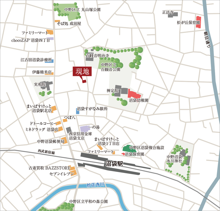 西武新宿線「沼袋」駅 徒歩4分 JR中央線「中野」駅 徒歩25分 ※自転車8分。1分=250mで計算しています。 |