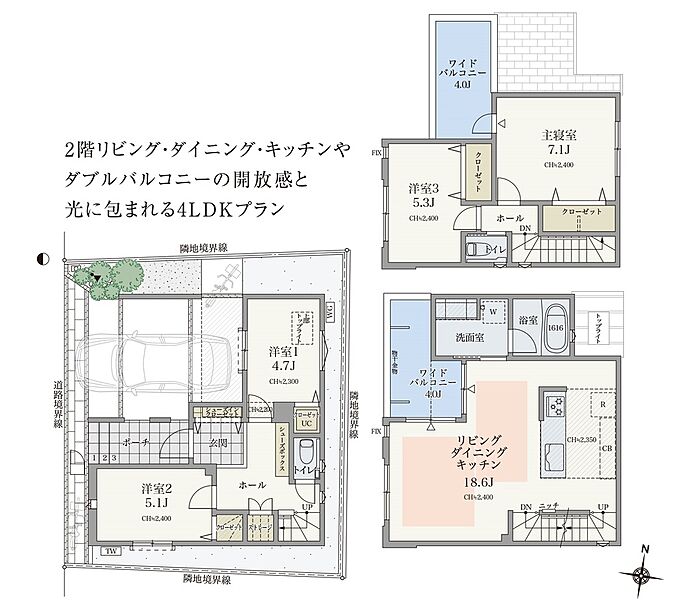 約18.6帖のLDKに加え、ダブルワイドバルコニーを採用し