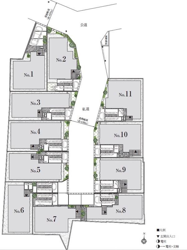 全11邸の街並み形成。通り抜けのない安心の街区設計を採用し、2階建3~4LDKのゆとりあるプランで家族の暮らしに配慮しています。
