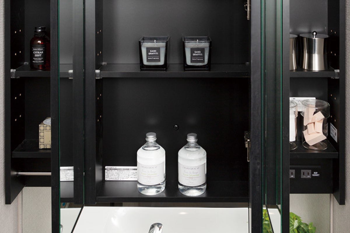 ミラーの裏は、洗面用具などの小物が収まる...