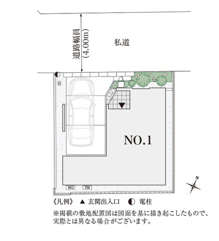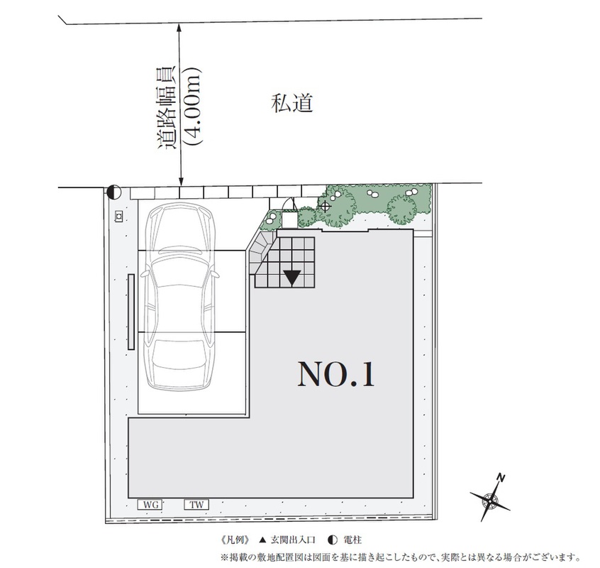 | 駐車場 | 1台 | 道路の幅員 | 北側4.00m私道 アスファルト舗装 |