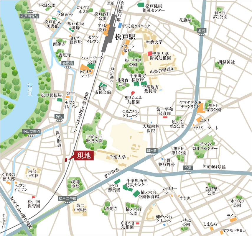JR常磐線「松戸」駅 徒歩15分 京成松戸線「松戸」駅 徒歩15分 JR常磐線「金町」駅 徒歩39分 |