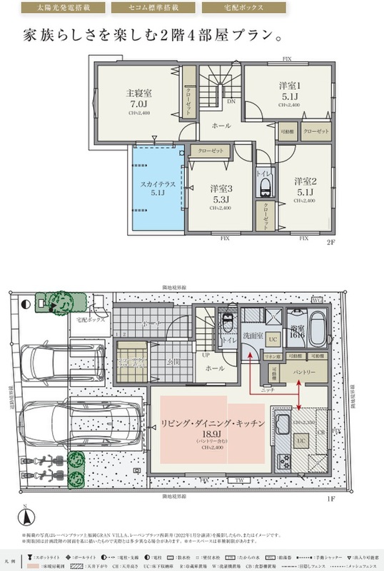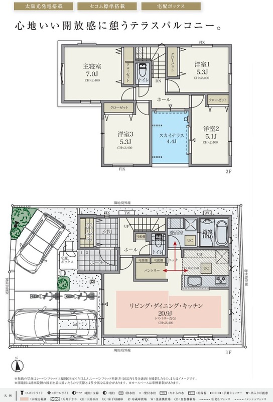 【全邸4LDK】スカイテラス付。車での来客時にも便利なカースペース2台分(※車種制限あり)