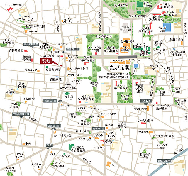 都営大江戸線「光が丘」駅 徒歩11分~12分 西武池袋線「練馬高野台」駅 徒歩25分~26分 西武池袋線「石神井公園」駅 徒歩30分 ※自転車10分。1分=250mで計算しています。 |