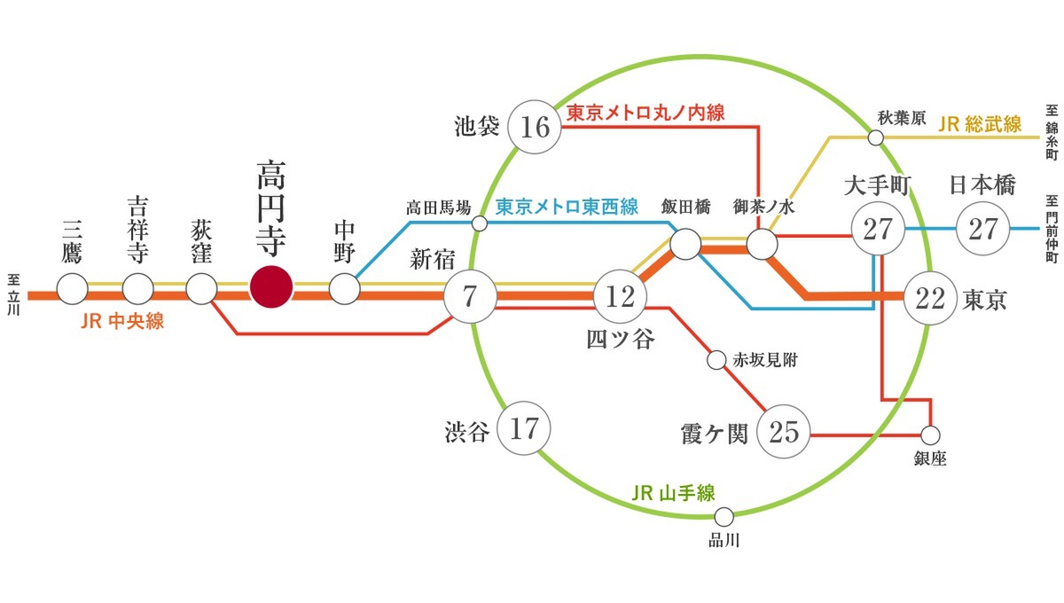 JR中央・総武線「高円寺」駅まで徒歩15分。JR中央線快速利用可能で、「新宿」駅や「東京」駅まで乗り換えなし!