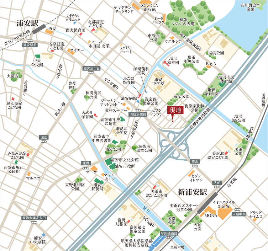 JR京葉線「新浦安」駅、東京メトロ東西線「浦安」駅が利用可能。現地から徒歩や自転車で気軽に行ける距離に公園や教育施設、買い物施設が点在し、利便性と自然の豊かさを享受できます。