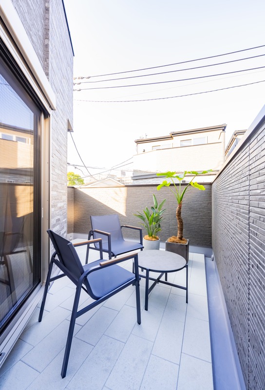 ダークトーンを基調とした、落ち着きあるデザインの外観。日々の生活の中でフレキシブルに活用できるインナーバルコニーや、愛車を雨風から守れるビルトインガレージを備えています。