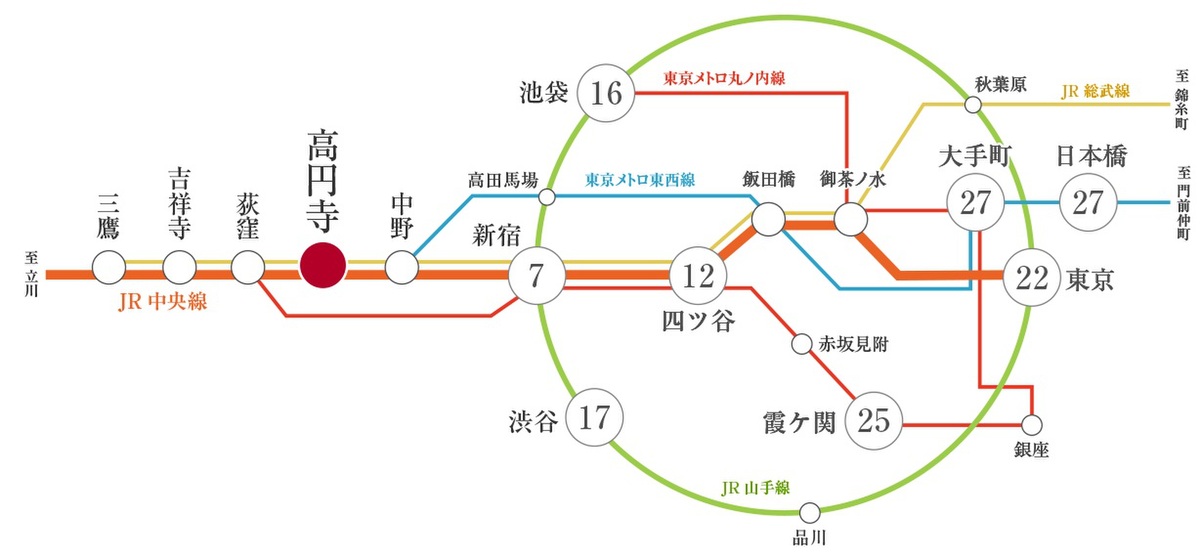 JR中央線「高円寺」駅 徒歩14分~14分 JR総武線「阿佐ケ谷」駅 徒歩21分 西武新宿線「野方」駅 徒歩15分 |