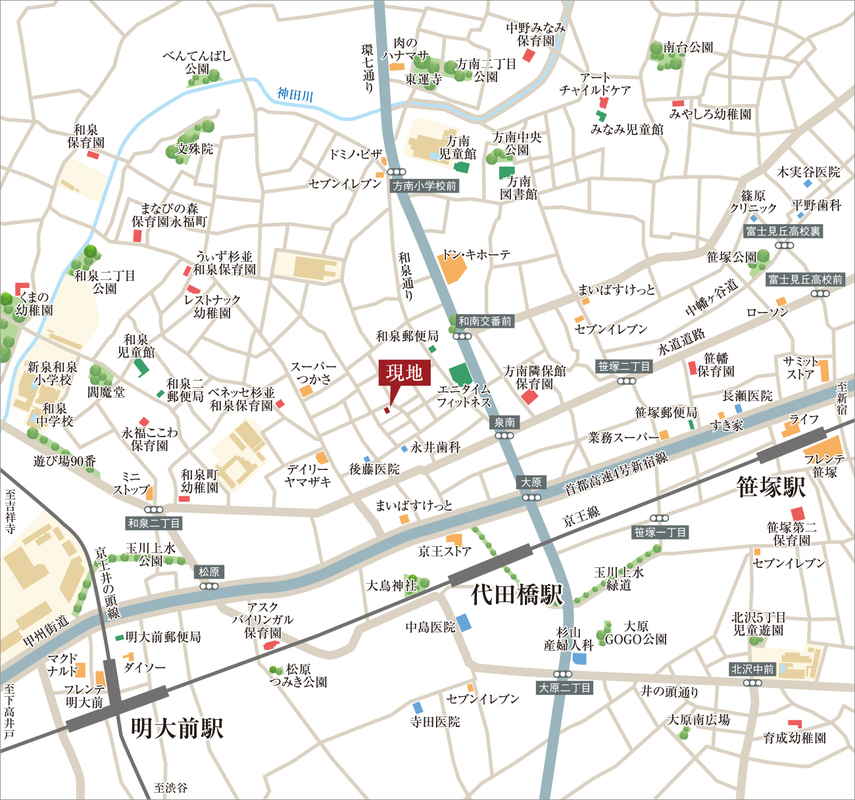 京王線「代田橋」駅 徒歩7分 東京メトロ丸ノ内線「方南町」駅 徒歩13分 京王井の頭線「明大前」駅 徒歩16分 |
