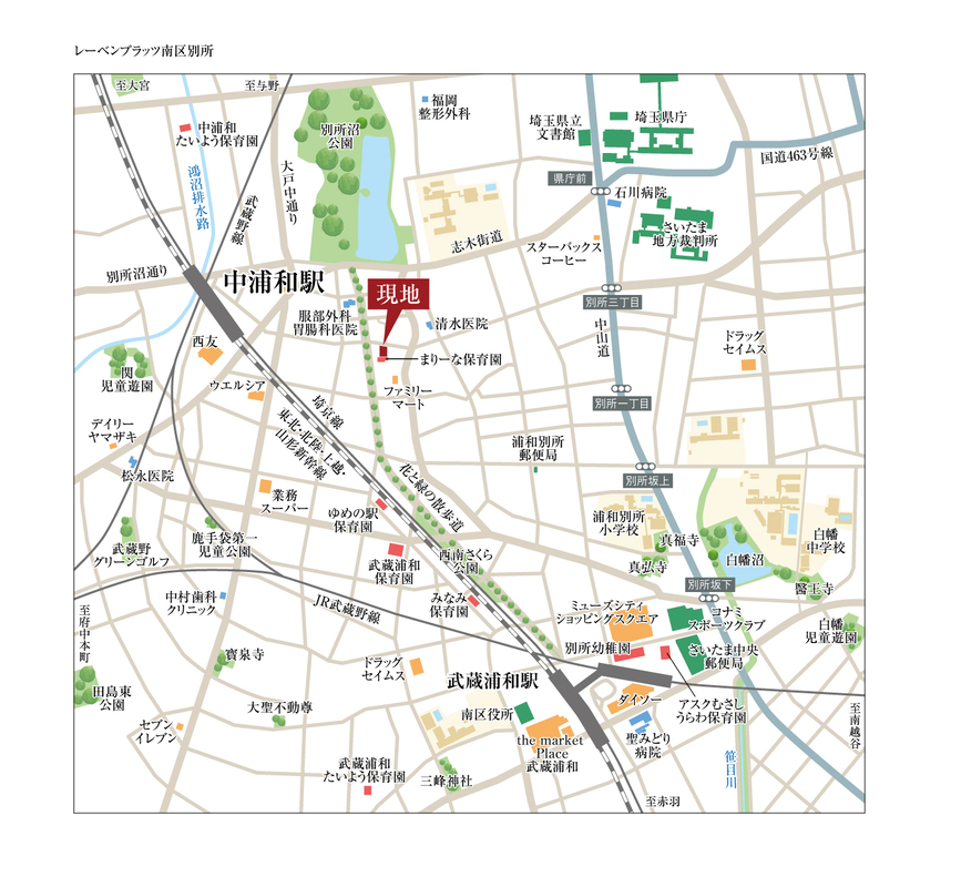 JR埼京線「中浦和」駅 徒歩5分 JR武蔵野線「武蔵浦和」駅 徒歩13分 JR京浜東北・根岸線「浦和」駅 徒歩21分 自転車約7分※自転車分数は実測です。 |