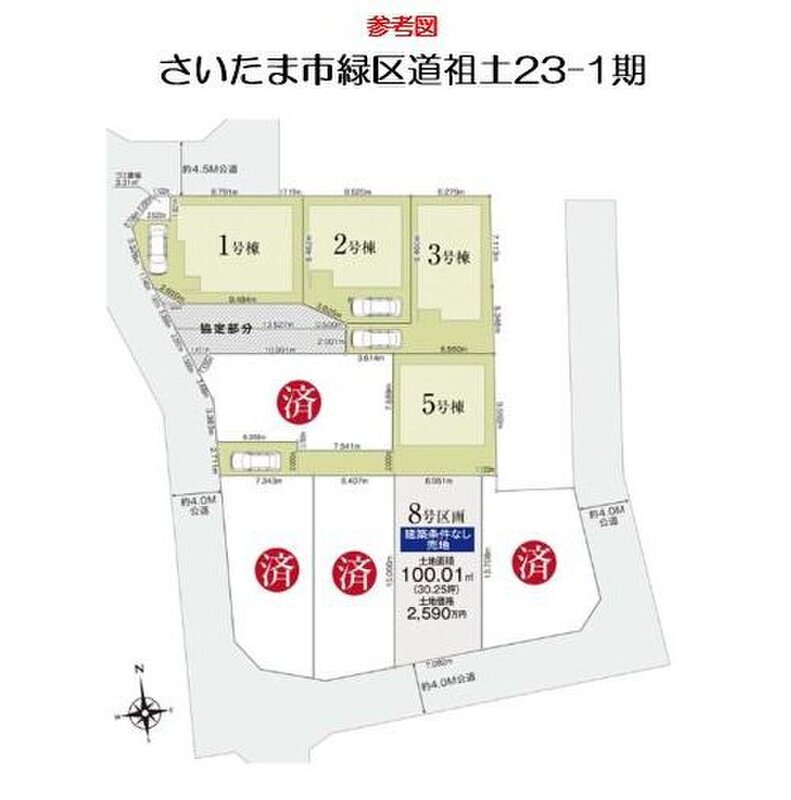 | 駐車場 | 1台 | 道路の幅員 | 4m・4.3m、アスファルト舗装、東側約4m公道・西側約4m公道・南側約4m公道・北側約4.3m公道 |