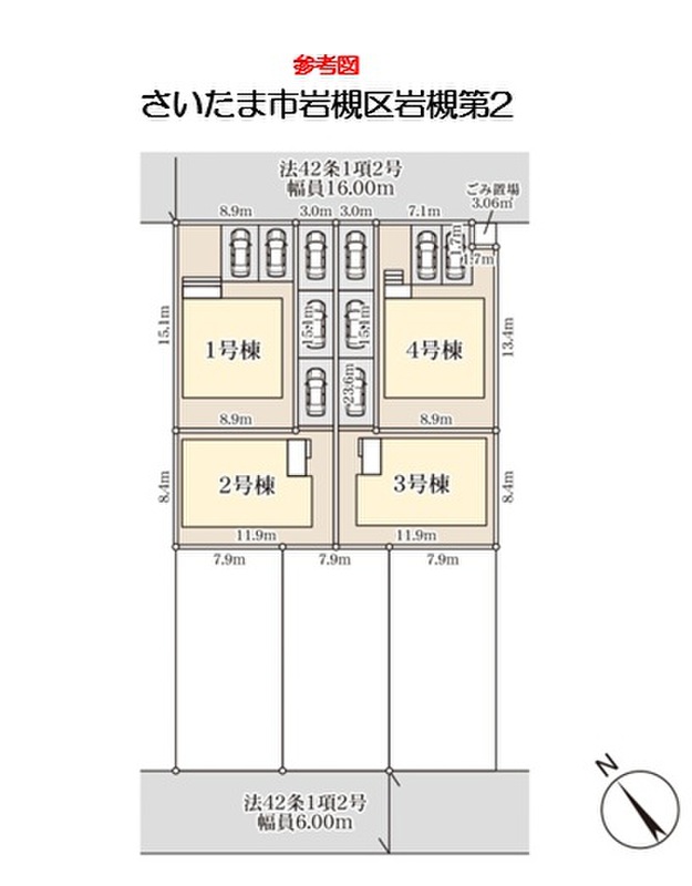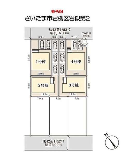 | 駐車場 | 2台 ~ 3台(2台(1・4号棟)、3台(2・3号棟)) | 道路の幅員 | 道路幅:16m、アスファルト舗装、 北東 16m 公道 |