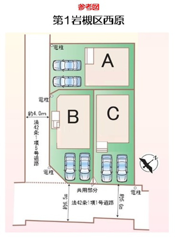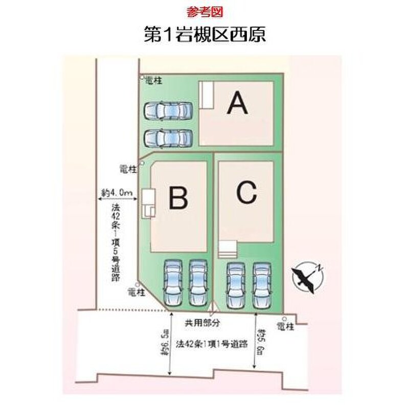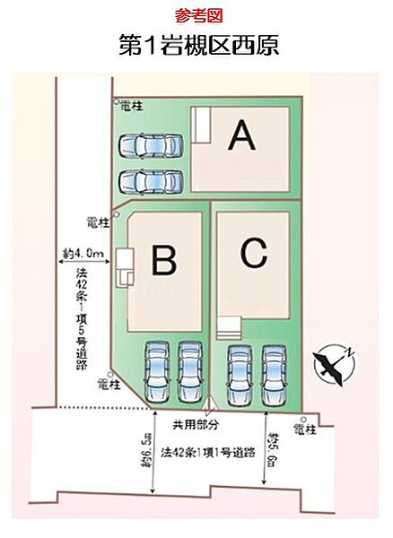 | 駐車場 | 2台 | 道路の幅員 | 道路幅:4m・5.6m、アスファルト舗装、南東公道約5.6m~約6.5m・南西私道約4m |