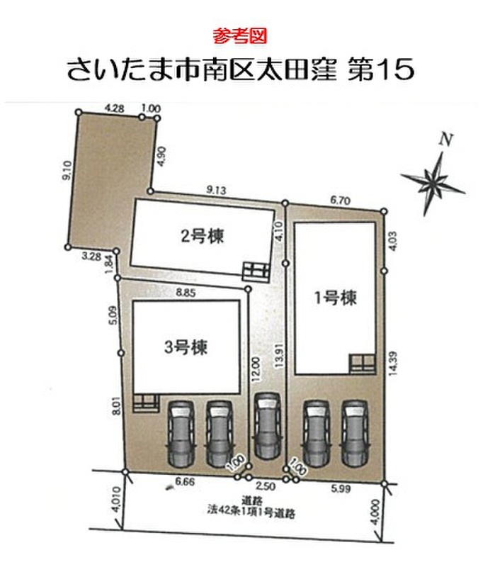 | 駐車場 | 1台 ~ 2台(1台(2号棟)、2台(1号棟、3号棟)) | 道路の幅員 | 道路幅:4m、アスファルト舗装、南 4m 公道 |