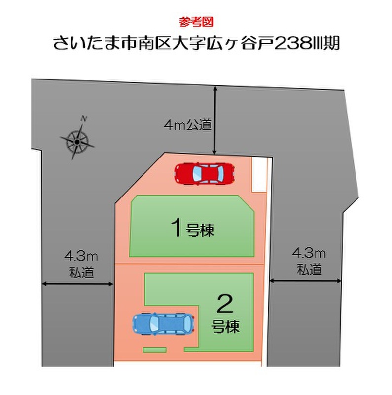 | 駐車場 | 1台 | 道路の幅員 | 道路幅:4m・4.3m、アスファルト舗装、西 4.3m 私道、東 4.3m 私道、北 4m 公道 |