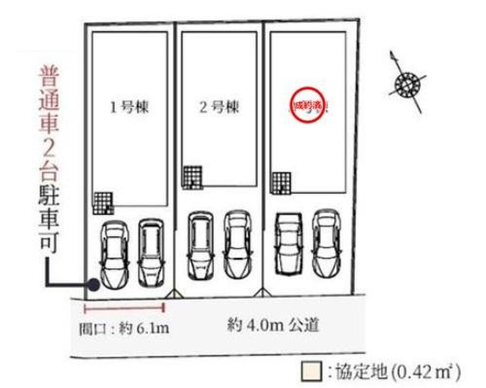 | 駐車場 | 2台 | 道路の幅員 | 道路幅:4m、アスファルト舗装、南西側約4.0m公道 |