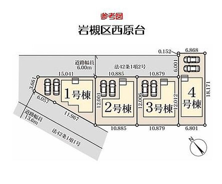 | 駐車場 | 2台 | 道路の幅員 | 道路幅:6m・13.6m、アスファルト舗装、 南西 13.6m 公道、北東 6m 私道 |