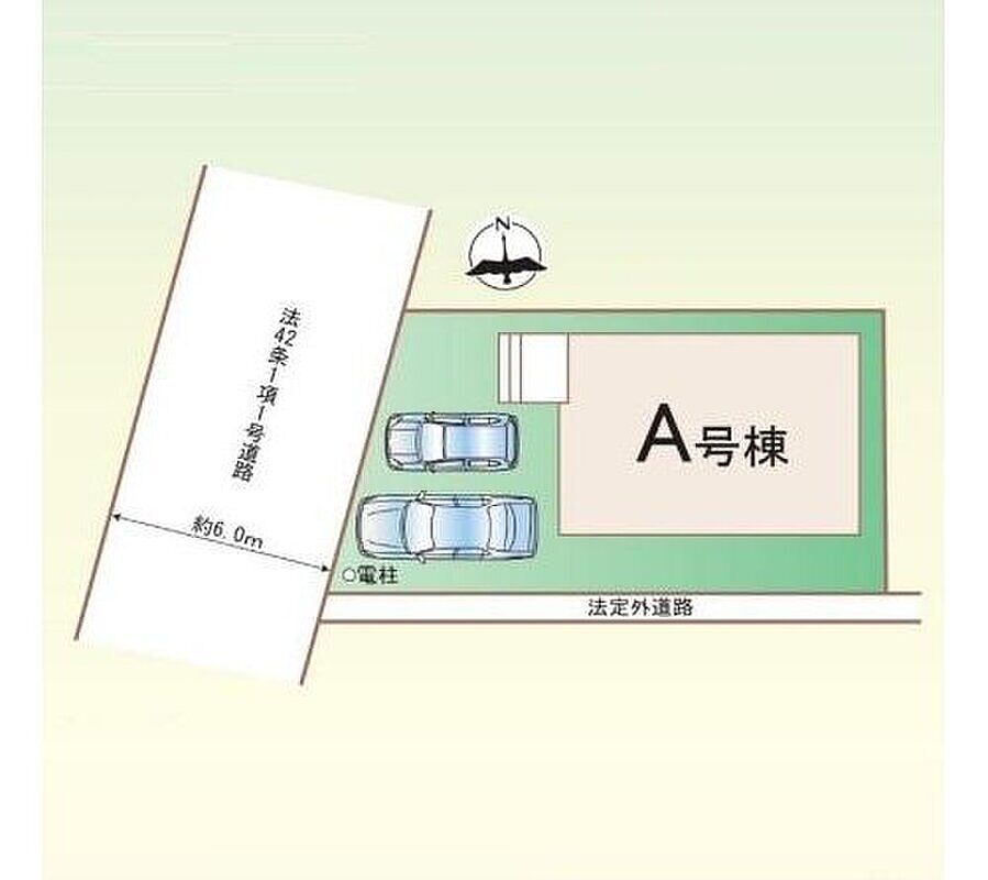 | 駐車場 | 2台(車種による) | 道路の幅員 | 道路幅:0.8m・6m、アスファルト舗装、南側法定外道路約0.8m、西側公道約6.0m |