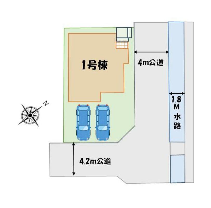 | 駐車場 | 2台 | 道路の幅員 | 道路幅:4m・4.2m、アスファルト舗装、北東側4.0m公道、南東側4.2m公道 |
