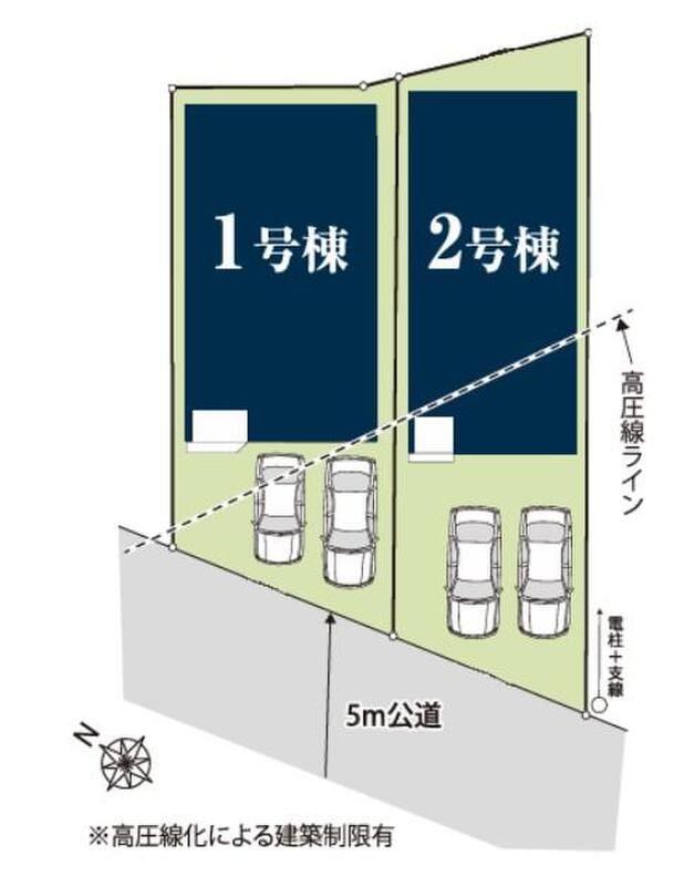 | 駐車場 | 2台 | 道路の幅員 | 道路幅:5m、アスファルト舗装、南西側5m公道 |