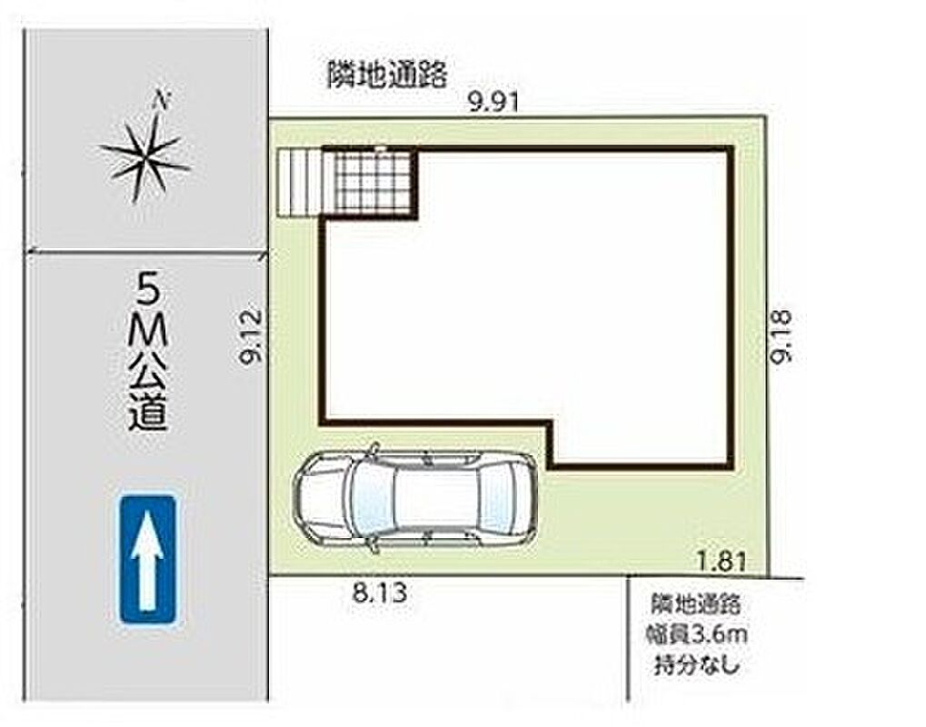 | 駐車場 | 1台 | 道路の幅員 | 道路幅:5m、アスファルト舗装、西 5m 公道 |