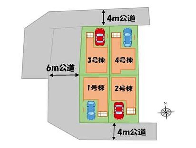 | 駐車場 | 1台 | 道路の幅員 | 道路幅:4m・6m、アスファルト舗装、西側:6m公道、北側:4m公道、南側:4m公道 |