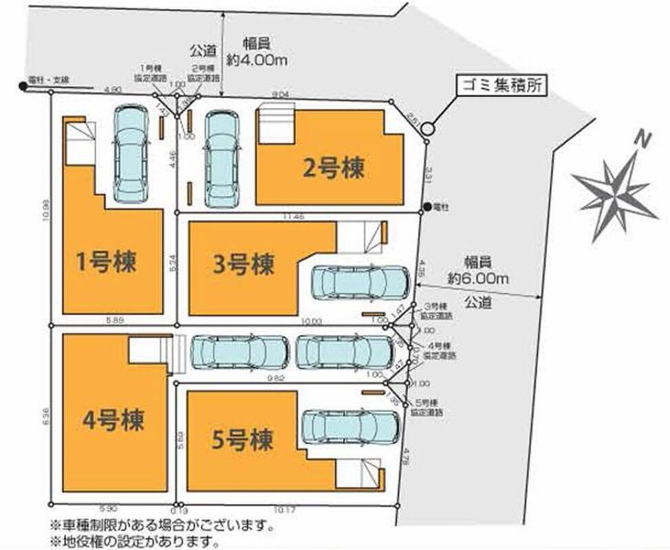 | 駐車場 | 1台 | 道路の幅員 | 道路幅:4m・6m、アスファルト舗装、 東 6m 公道、北 4m 公道 |