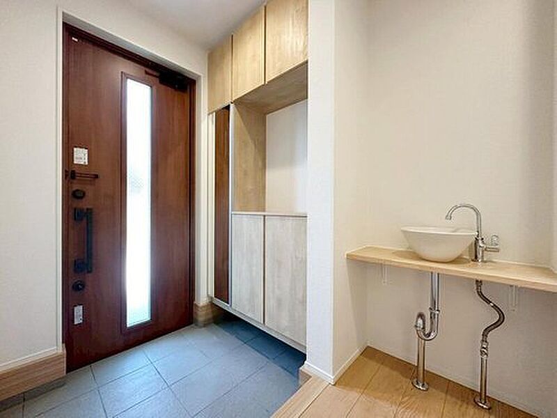 玄関に手洗いカウンターを設けました!帰宅後すぐに手洗いができるため、衛生的な動線を実現。