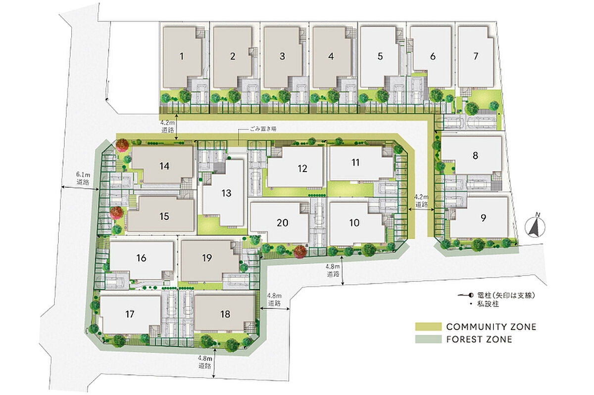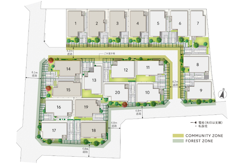 全20邸の街はL字型の街区内道路を計画。外周道路に面した邸の沿道には、緑の木立を多く配置しました。街に近づくと、豊かな緑と邸の外観が美しく調和する、まるで森のような景観が広がり、道行く日の心を癒します。街区内道路は、住人以外の人や車の通行が抑制され、コミュニティベンチや花の咲く木の元、街の人々の交流が自然に育まれます。