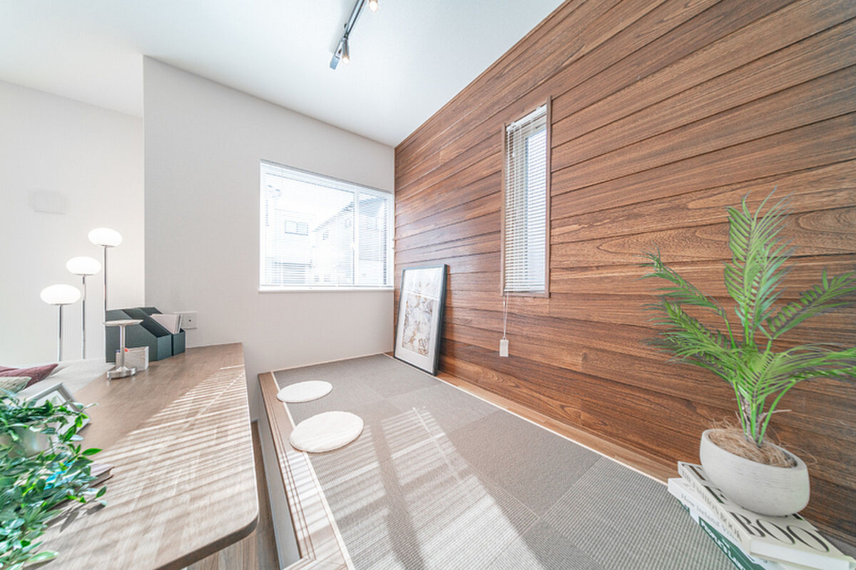 階段の段差を活用した小上がりとなった、見晴らしの良いステージ空間を創出。木の質感が味わい深い壁材を配し、ステージでの時間を心地良いものにしてくれます。家事効率を高め、暮らしがスムーズになるユーティリアがあることで自分時間はもちろん、家族で過ごす自由な時間を楽しむ暮らしが叶います。