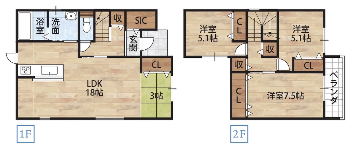 18号地リビングはエアコン設置済み!LDK広々18帖!3帖の畳コーナーもございます。各居室クローゼット・玄関にはシューズクローゼットがあり収納豊富です。