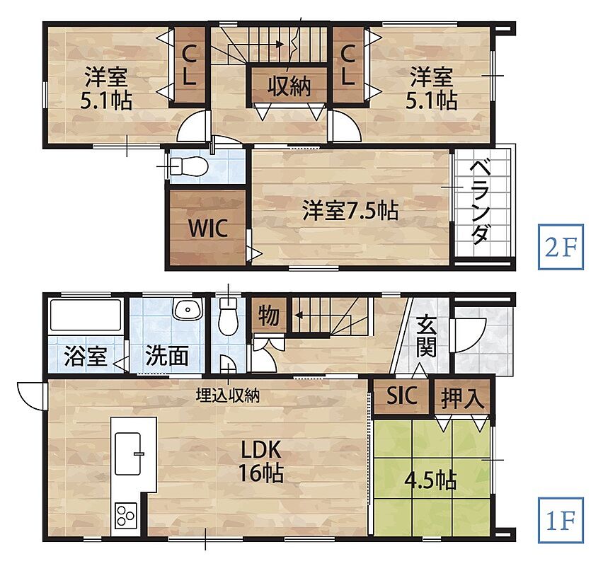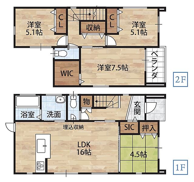 LDK16帖と和室4.5帖!和室の戸を開放すればリビングと繋げて広くくつろげます。ウォークインクローゼット、シューズクローゼットなど収納豊富!