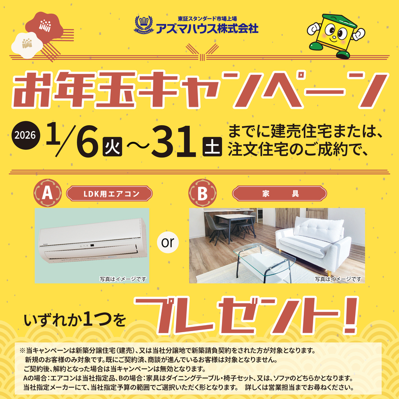 ●当社新築建売住宅をご購入の方を対象に、 「住宅ローンサポート ご成約キャンペーン」実施中! ●ご来店キャンペーン「ハズレなし!くじ引き抽選会」開催中! キャンペーン期間:2026年1月31日(土)まで 進呈時期や進呈条件など、詳しくは営業担当者までお尋ねください! ●期間中に当社新築建売住宅をご購入の方を対象に、 「お年玉キャンペーン」実施中! LDK用エアコンor家具のいずれか1つをプレゼントいたします! ※エアコンは当社指定品、家具はダイニングテーブル・椅子セットまたはソファのどちらかとなります。 キャンペーン期間:2026年1月6日(火)~1月31日(土) 詳しくは営業担当者までお尋ねください! ※TVアンテナ(ケーブル含む)・カーテンレールはオプション工事となります。 ※電波障害による共聴ケーブルアンテナの引き込み等はお客様負担となります。 ※敷地内に電柱および支線が設置される場合があります。 ※図面と現況が異なる場合は、現況優先となります。ご了承下さい。 ※販売価格・物件概要等について訂正または変更している可能性があるため、契約前に内容をご確認ください。 ・当社ホームページ https://azumahouse.com/company ・アズマハウスの注文住宅 https://azumahouse-chumon.com/ ・和歌山おうち&とち検索ネット https://www.azumahouse-fudousan.com/ ・和歌山おうち&とち売却ネット https://azumahouse-sale.com ・【和歌山ルームツアー】アズマハウスチャンネル ルームツアー動画を公開中!ぜひご覧ください。 https://www.youtube.com/channel/UCjAtJmvl06tyZqlq3p0iiHA/featured |