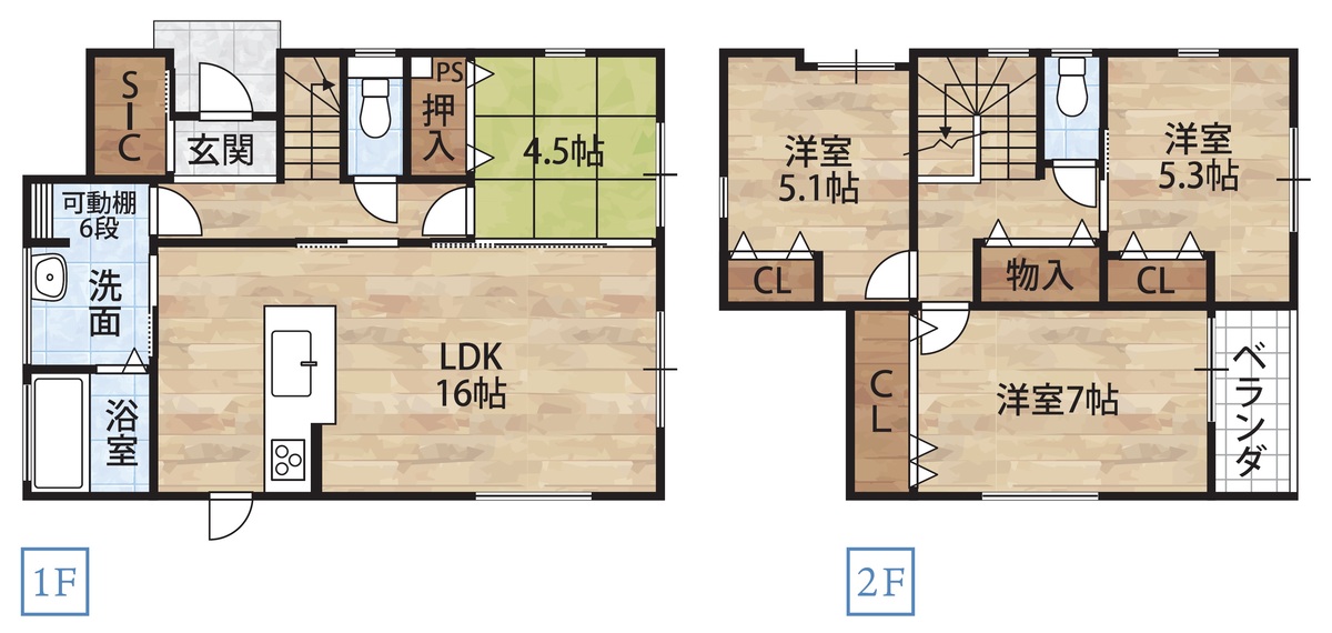 LDK16帖と和室4.5帖!洗面室には室内物干し付きで雨の日や夜間のお洗濯も安心です。シューズクローゼットに靴や傘、ベビーカーなどたっぷり収納できて、散らかりがちな玄関もすっきりきれいに!