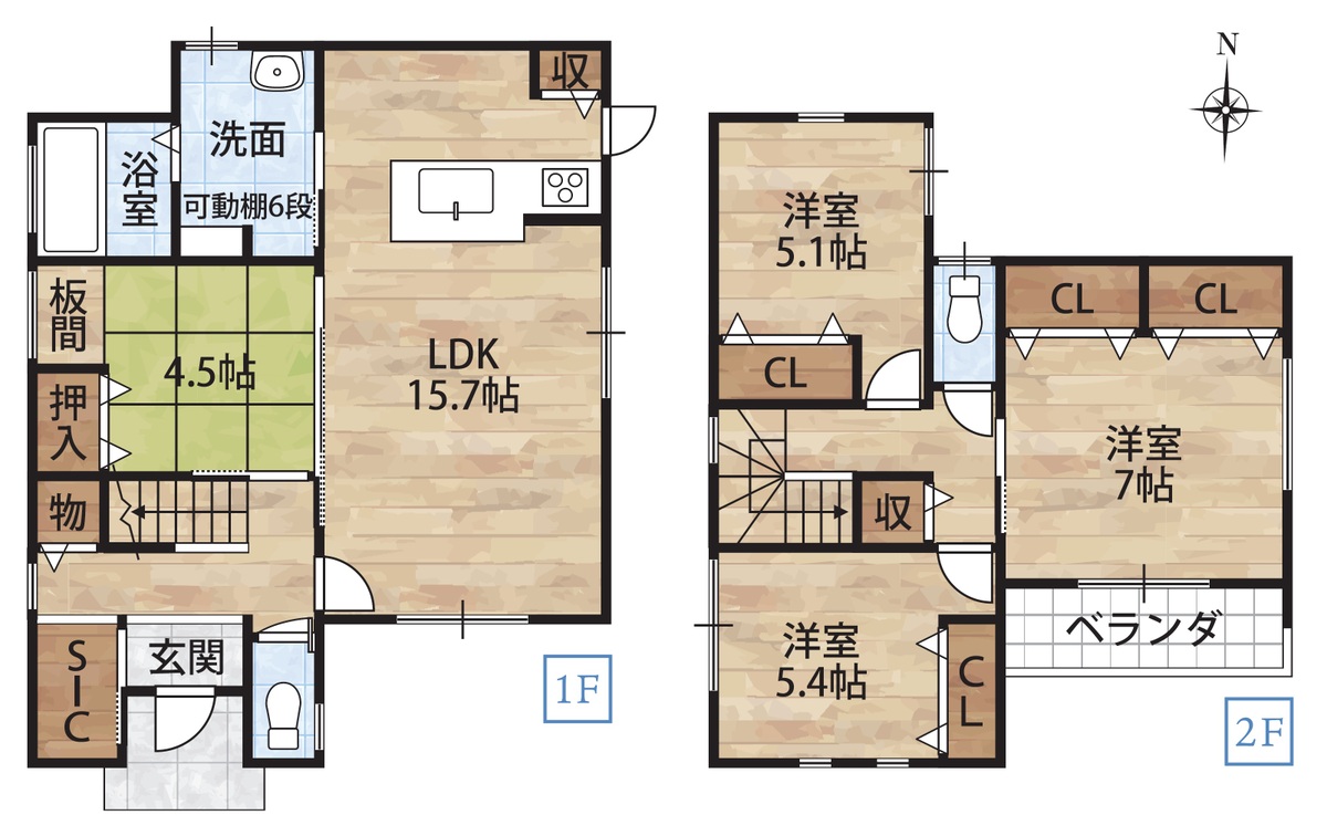| 建物面積 | 98.71m2(29.85坪)・99.54m2(30.11坪) | 土地面積 | 148.70m2(44.98坪)・149.71m2(45.28坪) |