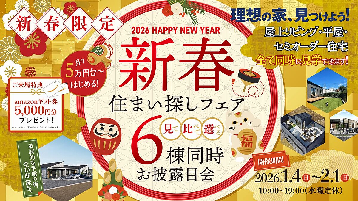 “新しい暮らしが始まる、あらゆる世代のための平屋の街。” 同世代が集う安心感と、自然に育まれるコミュニティ。 家族みんなが笑顔になれる日常が、ここから始まります。 この街の魅力は、子育て世代だけではなく、あらゆるライフステージに寄り添う住まいであること。 シニア世帯やシングル世帯、共働きファミリーまで、 誰もが心地よく暮らせるように考え抜かれた“平屋スタイル”の街です。 ■ 建物のこだわり ・勾配天井がもたらす開放感 (リビング天井高:最大4.0m~2.9m) ・ワンフロアで生活動線が簡潔。 階段の上り下りがないため、毎日の負担を軽減します。 ■ 魅力ポイント ・全区画50坪超のゆとりある敷地 ・南道路中心の明るい街並み ・駐車スペース2台以上確保 ・ガーデニング、家庭菜園、ドッグラン、BBQも楽しめる広々庭付き ・街区内道路はゆとりの幅員で駐車も安心 ■ こんな方におすすめ ・子育て世代の方へ:安全で目の届くワンフロア設計。家族との時間を大切にしたい方。 ・シニア世帯の方へ:階段のない住まいで、将来も安心して暮らしたい方。 ・単身・DINKSの方へ:コンパクトかつ機能的に暮らしたい方。 ・アウトドア好きの方へ:庭付きで趣味や自然を楽しみたい方。 ■ 来場特典 資料請求・来場予約でAmazonギフト券プレゼント実施中! ※初回来場・1家族1点・アンケート&事前審査をご記入頂いたお客様限定 |