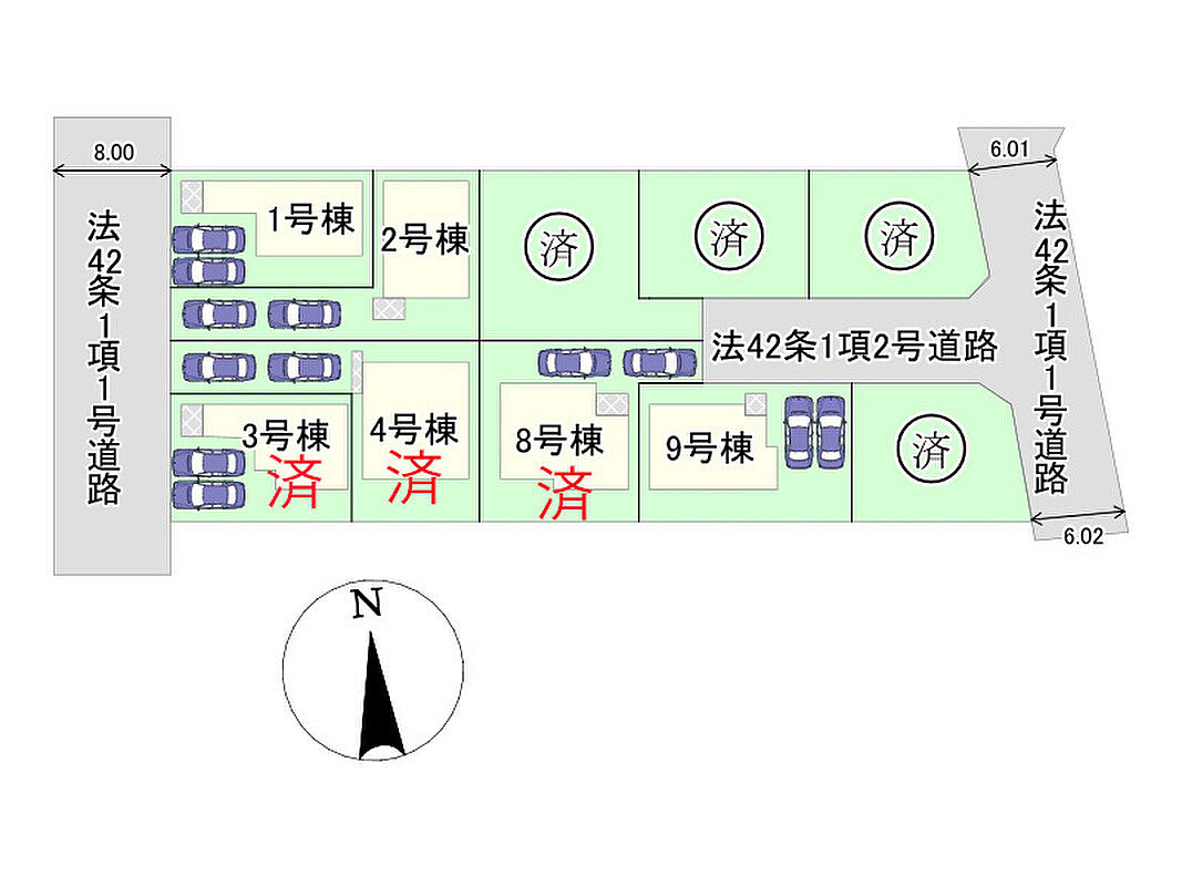 | 駐車場 | 2台 | 道路の幅員 | 東側公道6m、西側公道8m、中央側私道5m |