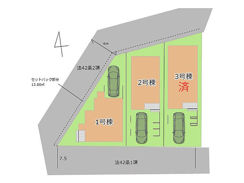 | 駐車場 | 1台 | 道路の幅員 | 南側7.4m公道 北西側3.2m公道 |