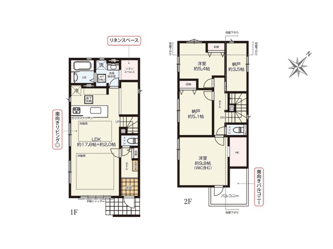 19帖超の広々リビング、床暖房付です! 両棟WIC・納戸付きで収納には困りません!