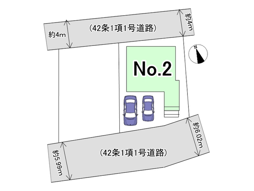 | 駐車場 | 2台 | 道路の幅員 | 南側約6m、北側4m |