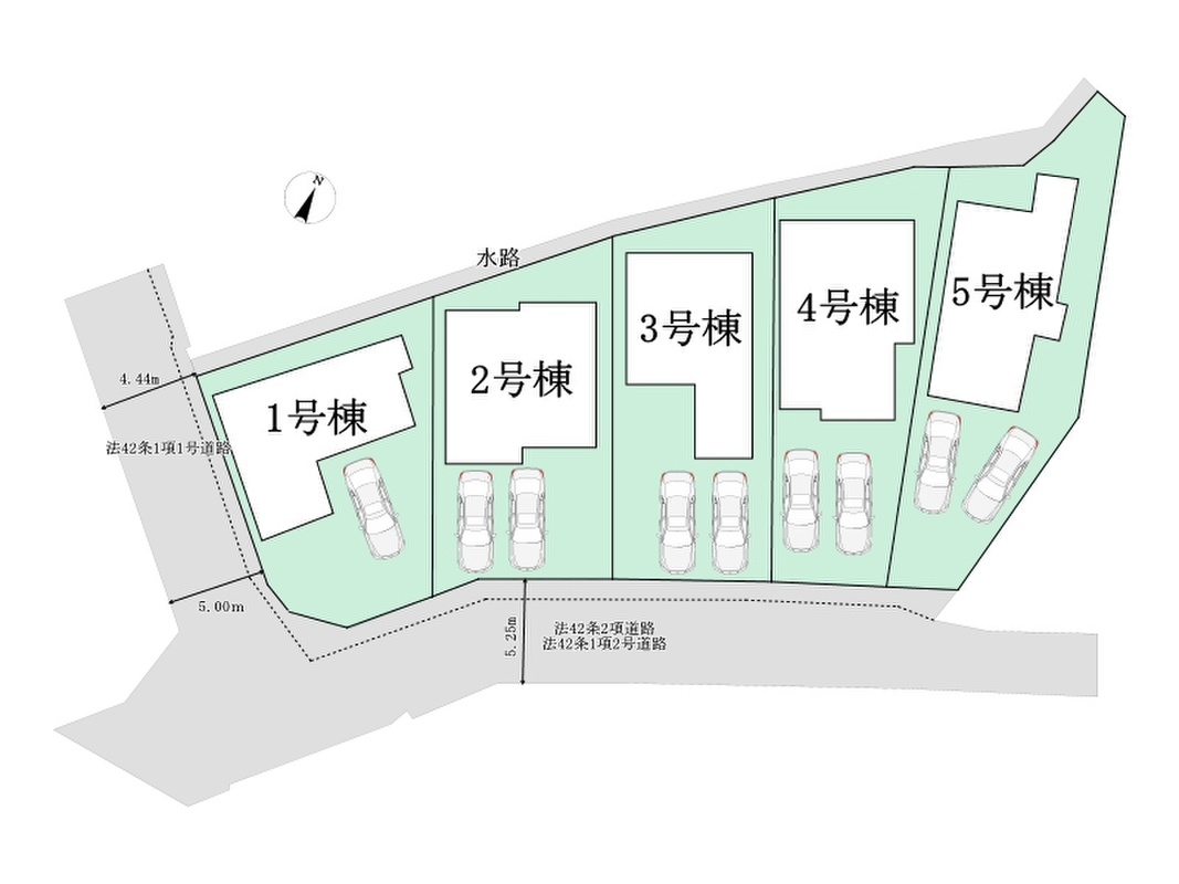 | 駐車場 | 1台 ~ 2台(2台(4戸)1台(1戸)) | 道路の幅員 | 南東側約5.25m 南西側約5.0m |