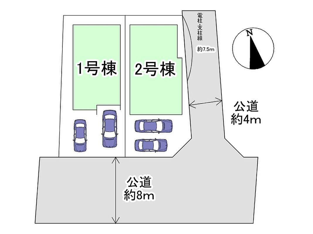 | 駐車場 | 2台 | 道路の幅員 | 南側8m、東側4m |