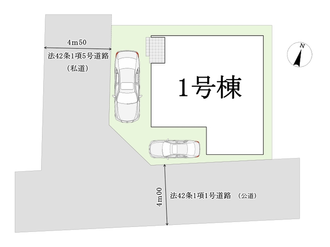 | 駐車場 | 2台 | 道路の幅員 | 南側約4m公道 西側約4.5m私道 |