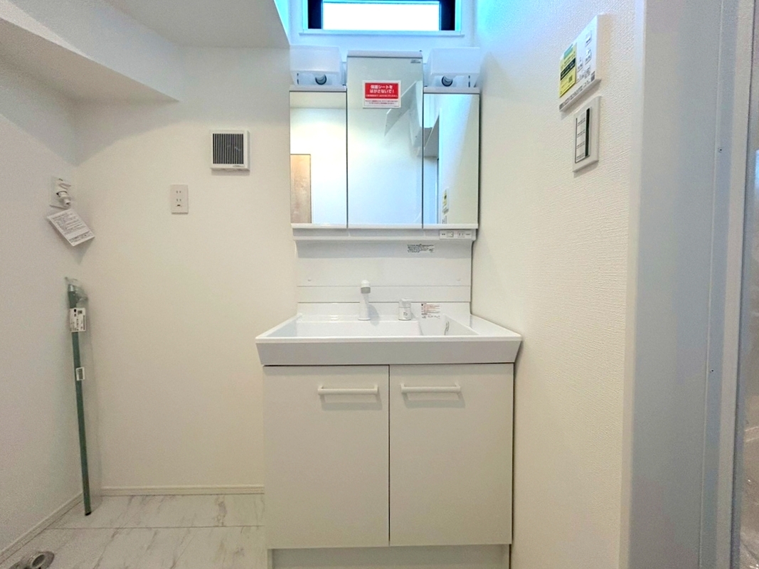 大きな三面鏡がついた洗面化粧台。鏡の裏に...