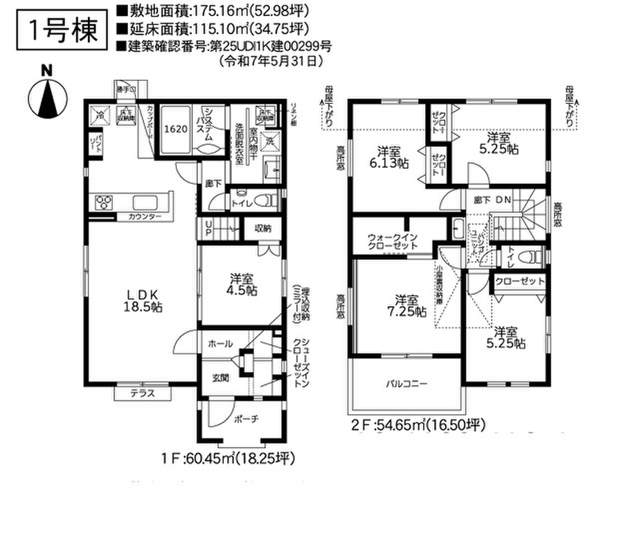 1号棟 間取り 5LDK+WIC+SIC+小屋裏収納 価格 14800万円 建物面積 115.10m2 土地面積 175.16m2