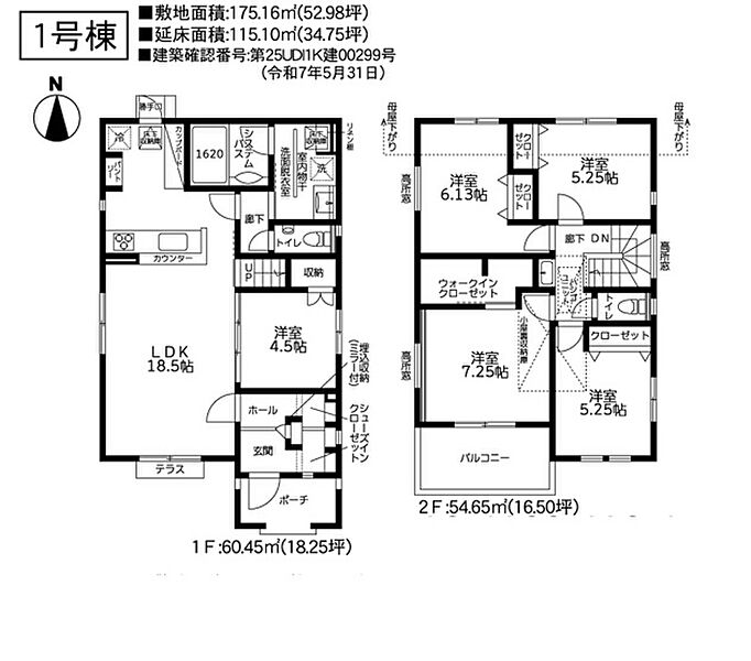 1号棟 間取り 5LDK+WIC+SIC+小屋裏収納 価格 14800万円 建物面積 115.10m2 土地面積 175.16m2 -