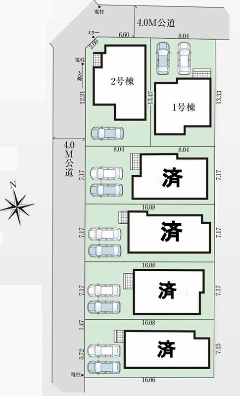 | 駐車場 | 1台 ~ 2台(1台(2号棟)、2台(1、3、4、5、6号棟)) | 道路の幅員 | 北側公道4m、西側公道4m |