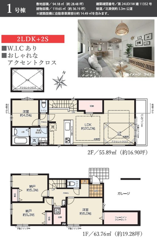 1号棟 間取り 2LDK+2S+WIC 価格 9599万円 建物面積 119.65m2(自動車車庫部分約14.49m2含む) 土地面積 94.18m2