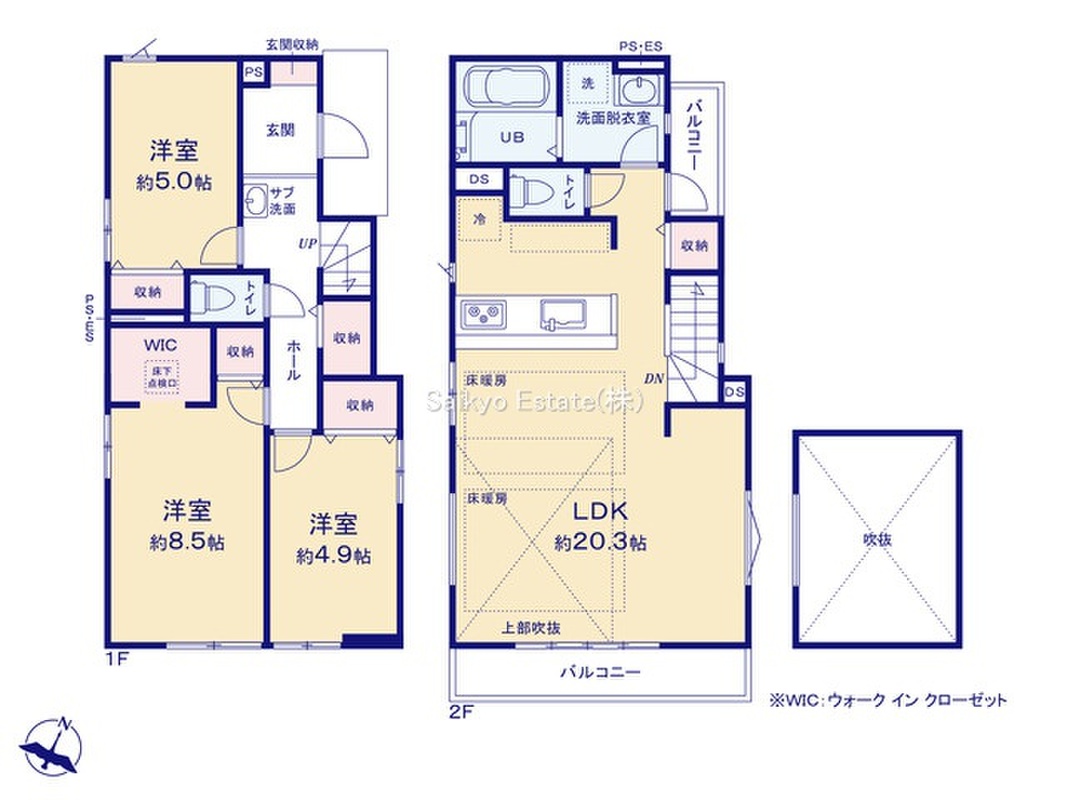 LDK広々約20.3帖!収納付き居室3部屋!リビング上部吹抜けで明るい空間となっております。2面床暖房!食洗機や浴室暖房乾燥機など設備充実!WICやリビング収納など収納豊富!駐車2台可!